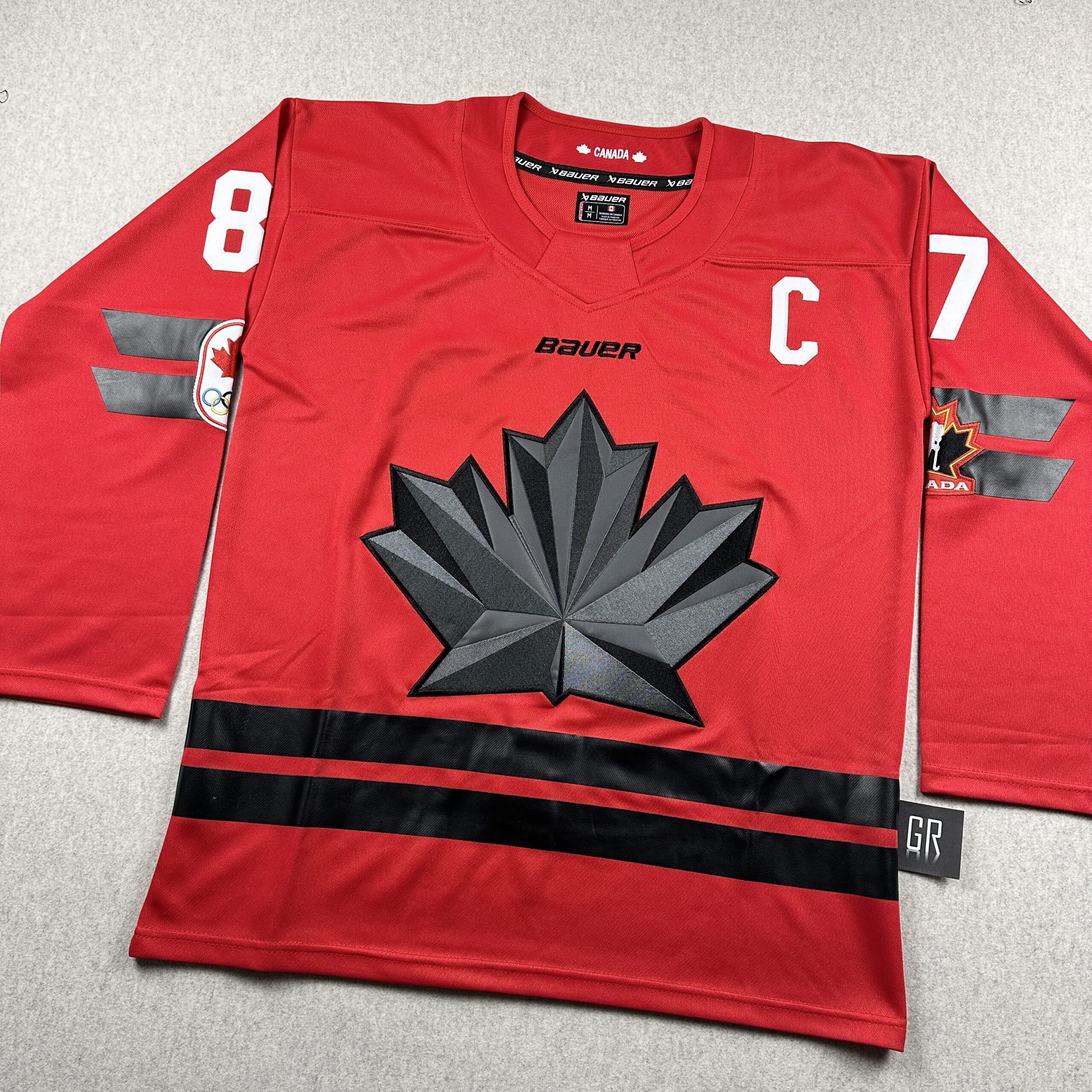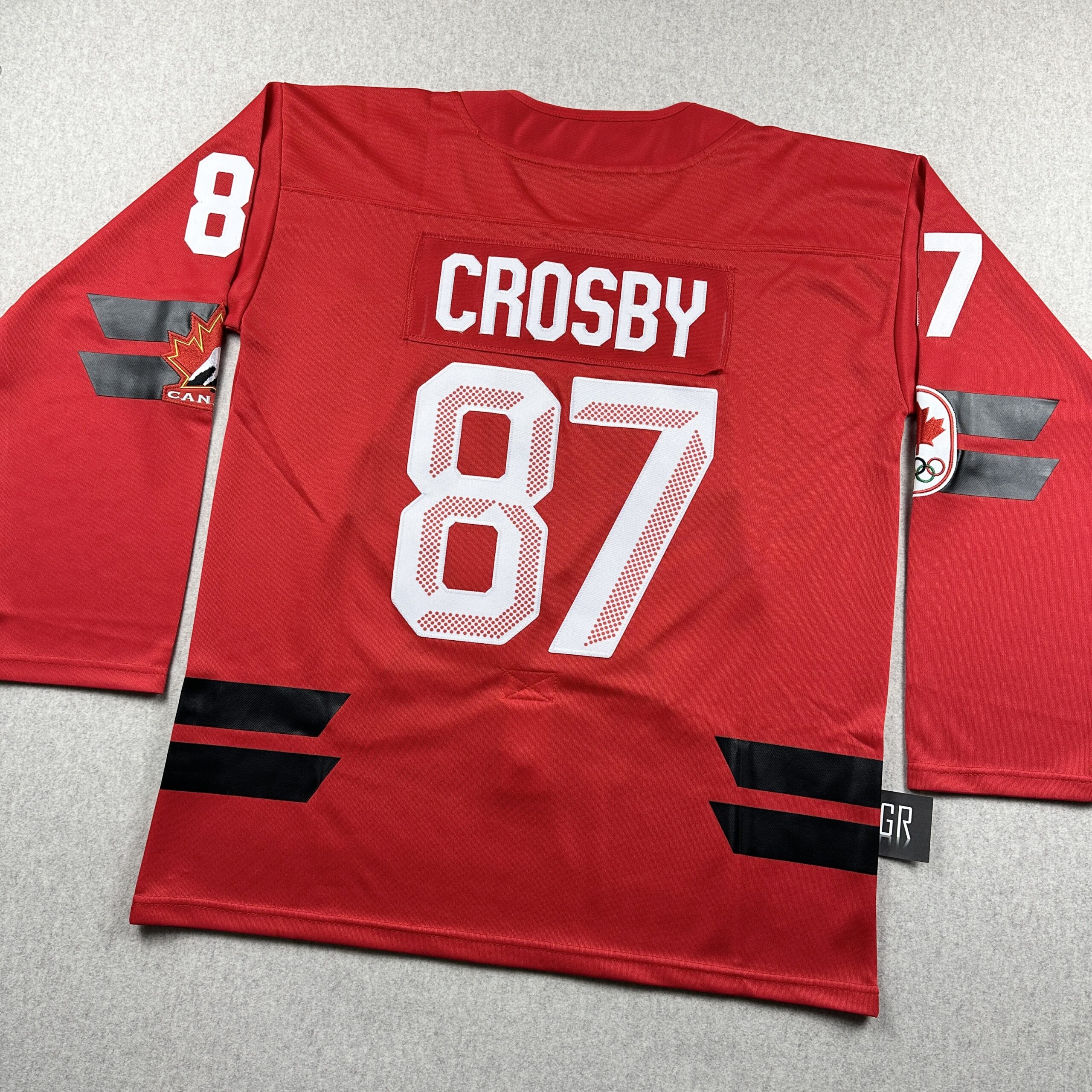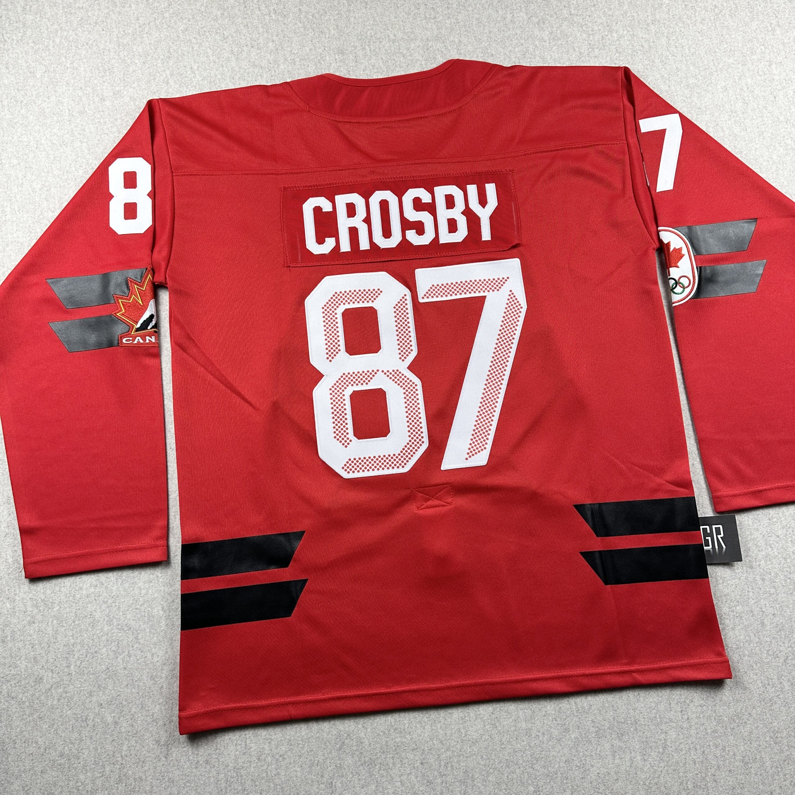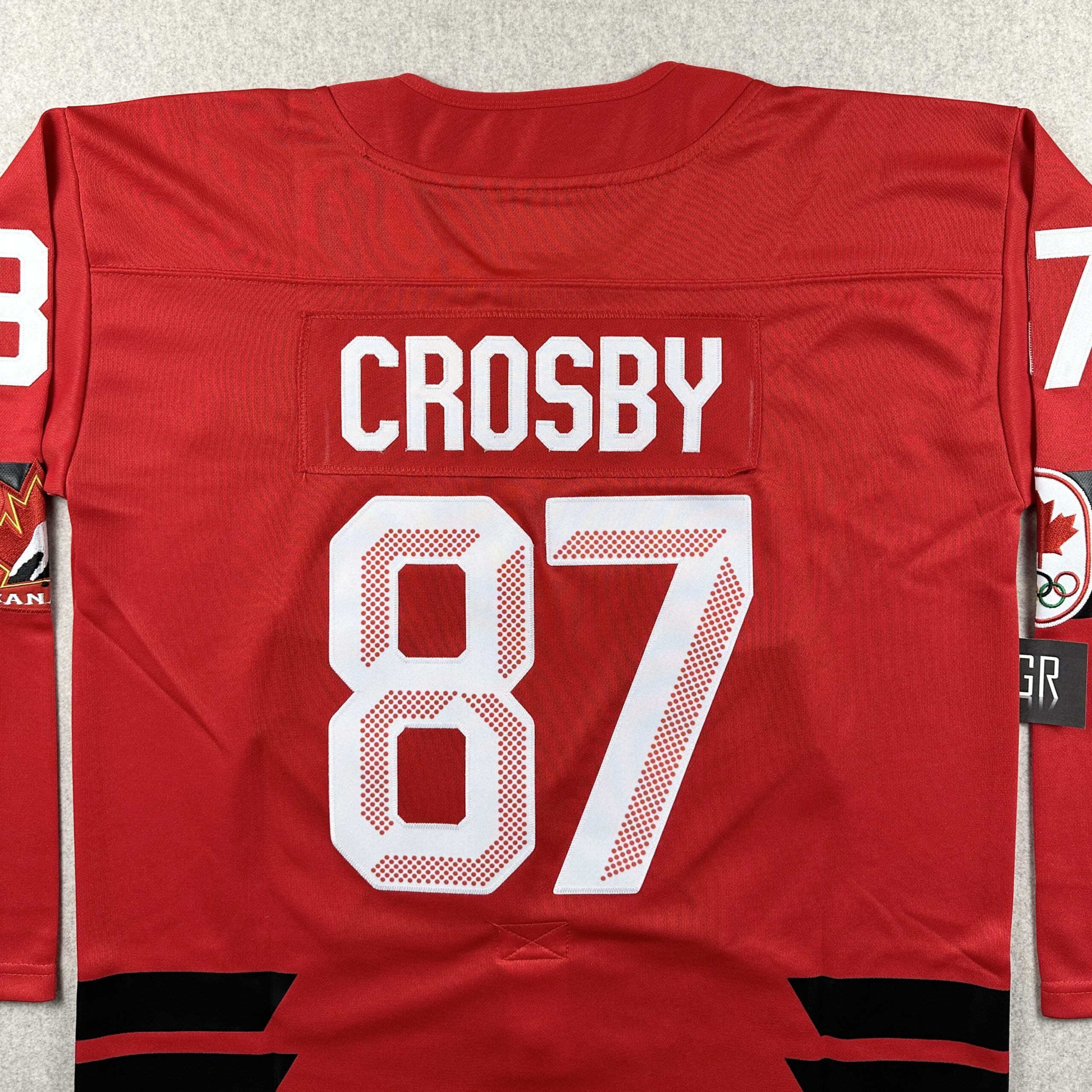 These are high quality replicas. Letters and numbers are stitched.